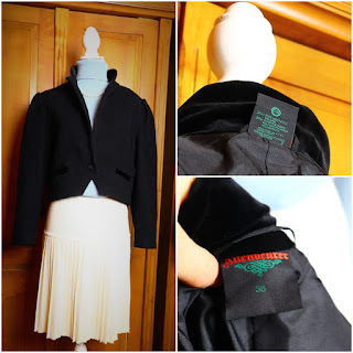 Sacou vintage Altenbeurer by C&A,de culoare negru intens,realizat din 80% lână,20% nylon,căptușit,umeri bufanți.Interior gulerul este din catifea.Croială dreaptă,mai scurtă.Buzunarele nu sunt funționale și sunt decorate tot cu o bucată de catifea.