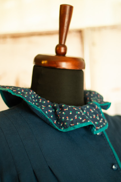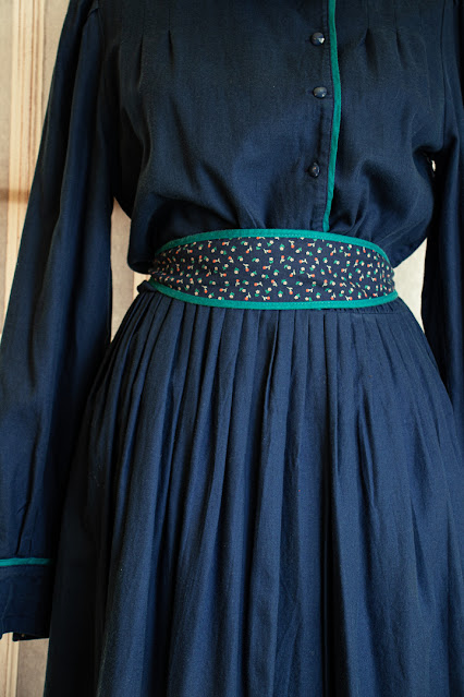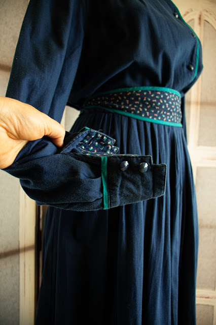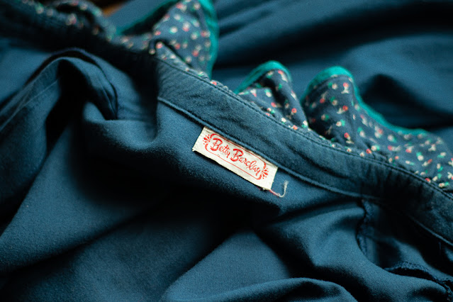 Rochie vintage midi semnată Betty Barclay,cu mânecă lungă,detalii superbe pe guleraș tip victorian -cu print floral-,cu brâu propriu,care se leagă în spate, print asemănător gulerului.De culoare albastră - pozele cu culoarea mai deschisă,de exp ultimele 3 poze.Căptușită de la talie în jos,fermoar lateral.Rochiță feminină.