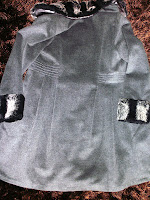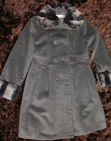 Este dintr-o stofa fina, de culoare gri, captusit (nu are vatelina), incheiat la 2 randuri de nasturi, cu o croiala eleganta, accesorizat cu guler detasabil si mansete de blanita de sinsila artificiala. Este deosebit de frumos, de cea mai buna calitate si asteapta o fetita de 10-12 ani care sa il scoata la plimbare. Lungimea lui este de 77 cm, iar lungimea manecii de 52 cm.