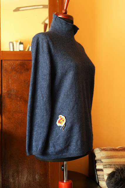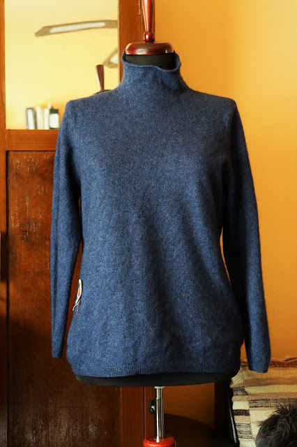 Bluză albastră Chelsea Rose Nyc,realizată din 70% lână merinos, 30% cașmir ( nu înțeapă deloc la purtare,este foarte moale).Pe partea dreaptă,zona șoldului cum ar veni,are o broderie frumoasă cusută de mână (cel mai probabil pentru a o masca o bucată din material cu defect).