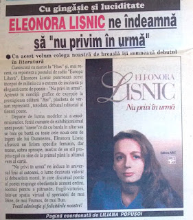 Cunoscută ca ziarist la Flux și, mult mai recent, ca reporteră a postului de radio ”Europa Liberă”, Eleonora Lisnic punctează acest început de mileniu cu o extrem de incitantă și elegantă carte de poezie – ”Nu privi în urmă”.