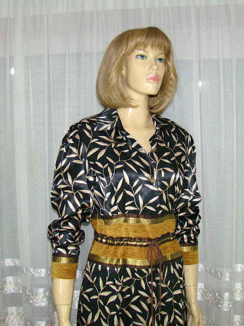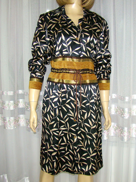 Rochie model unicat, lucrata pe comanda, o combinatie de vascoza si alte materiale, pe toata partea de talie si spre sold are aplicat un fel de brau care se strange in talie cu un siretel, atat in partea de sus a acestuia cat si in partea de jos are cateva pliuri care ofera usoara lejeritate rochiei spre bust si putin spre sold, se incheie cu nasturi si are fermoar lateral, mansetele sunt din acelasi material ca si partea din talie;