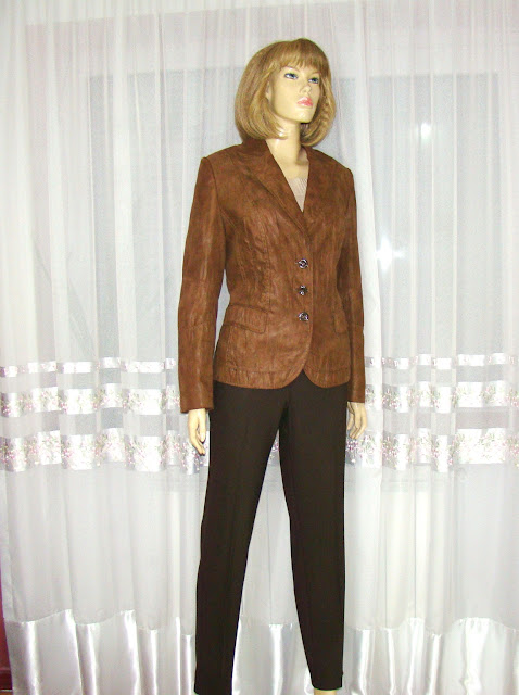 Taior conform et, de la BETTY BARCLAY, materialul imita f. bine pielea intoarsa, are o textura usor creponata cu un luciu mat, mai atenuat in realitate decat in foto, croiul este frumos cambrat pe linia corpului, buzunare cu clapete;