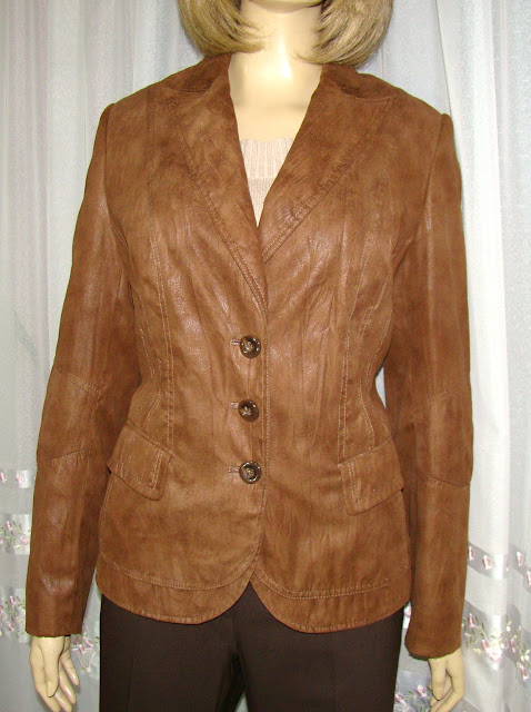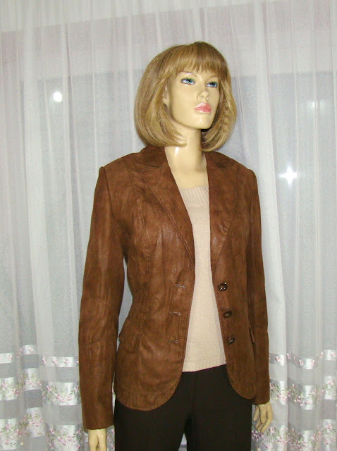 Taior conform et, de la BETTY BARCLAY, materialul imita f. bine pielea intoarsa, are o textura usor creponata cu un luciu mat, mai atenuat in realitate decat in foto, croiul este frumos cambrat pe linia corpului, buzunare cu clapete;