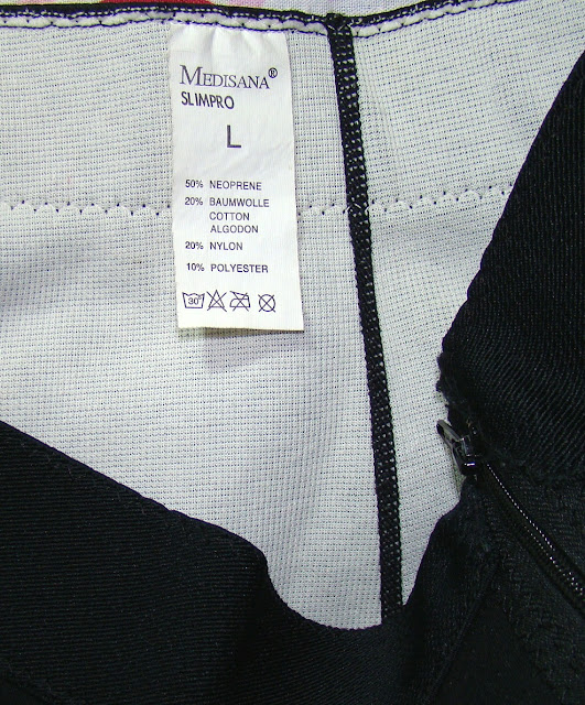 Pantaloni conform et, de la MEDISANA SLIMPO, conceputi pentru slabit, materialul contine 50% neoprene, 20% bbc si 20% nylon, textura este groasa dar elastica, aceste substante din continutul fibrelor incalzesc in mod considerabil corpul si prin transpiratie se elimina atat kilogramele in plus cat si o parte din toxinele din corp. In fata au un tighel ce marcheaza dunga pantalonilor, asa incat pot fi purtati ca orice pantaloni cu un design obisnuit, partea din talie este un elastic tip jartea lat si gros, se incheie cu fermoar lateral, croiul este conic, pe picior;
