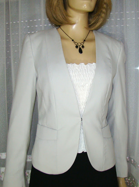 Taior vascoza si alte fibre, conform et, H&M, croi simplu, elegant, in fata se incheie cu o simpla agatatoare discreta, are un slit micut la spate si la partea finala a manecilor, croiul este frumos cambrat pe corp, are doua buzunare mici in fata, frumos lucrat si finisat, culoarea este un gri-olive f.pal;