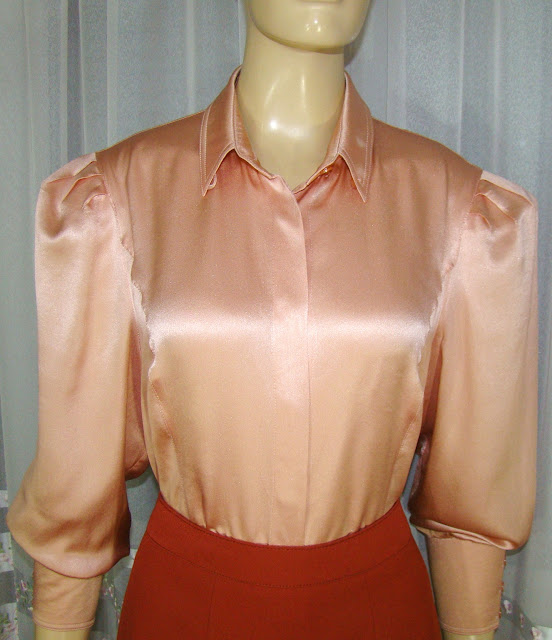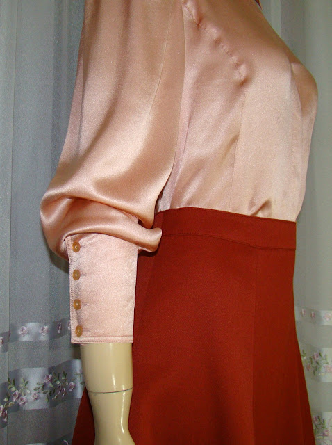 Bluza matase 100%, conform et., ANTONETTE, umeri cu umerasi speciali iar maneca are fronseuri in cusatura umarului, la partea finala a manecii manseta lata cu 4 nasturei, gulerul este un guler mic si drept care se incheie diferit, pe langa gat cu o brida de pe coltul gulerului din partea dreapta sau lejer doar cu nasturelul de la gat, culoarea este o nuanta calda, roz banan, se incheie cu nasturi ascunsi;