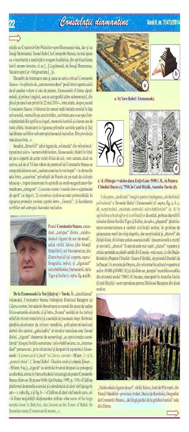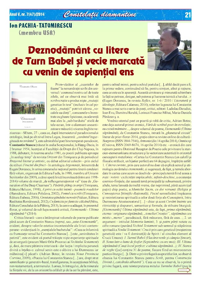 Ion Pachia-Tatomirescu: De la Turnul Babel la ultima săptămână. Constantin Stancu: Etemenanki, țiptul de pe acoperișul lumii