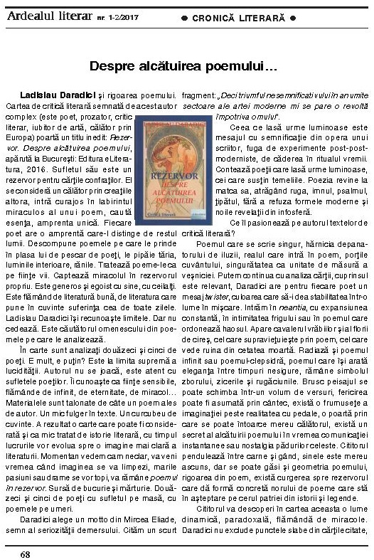 Litere • 30.10.2025 • 835 Opțiuni pentru acest articol Raportează o problemă Raportează acest articol Spune-ne ce nu este în regulă. Echipa noastră editorială va analiza raportarea în cel mai scurt timp. × Email Nume Motivul raportării Selectează motivulConținut ilegalÎncălcarea drepturilor de autor (DMCA)Spam sau conținut promoțional abuzivHărțuire sau atac la persoanăInformații false sau înșelătoareAlt motiv Detalii suplimentare Trimite raportul Ladislau Daradici: Poeți din Ardeal și mai departe. Poemul ca existență între lumi suprapuse. Cronica unor cărți dantelate Stancu Constantin Citește pe site-ul original Distribuie: X Facebook LinkedIn Reddit WhatsApp Copiază linkul Sursa: Mariana-PândaruRevista „Ardealul literar și artistic” Distribuie: X Facebook LinkedIn Reddit WhatsApp Copiază linkul