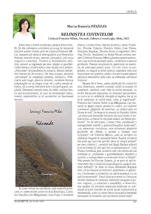 Litere • 23.10.2025 • 439 Opțiuni pentru acest articol Raportează o problemă Raportează acest articol Spune-ne ce nu este în regulă. Echipa noastră editorială va analiza raportarea în cel mai scurt timp. × Email Nume Motivul raportării Selectează motivulConținut ilegalÎncălcarea drepturilor de autor (DMCA)Spam sau conținut promoțional abuzivHărțuire sau atac la persoanăInformații false sau înșelătoareAlt motiv Detalii suplimentare Trimite raportul Maria-Daniela Pănăzan, NELINIȘTEA CUVINTELOR. Despre o carte de Lorinczi Francisc-Mihai, Năvoade, eseuri, note literare, Ed. CronoLogia, 2021 Stancu Constantin Citește pe site-ul original Distribuie: X Facebook LinkedIn Reddit WhatsApp Copiază linkul Sursa: Rev. Banchetul de primăvară, 2021 Distribuie: X Facebook LinkedIn Reddit WhatsApp Copiază linkul