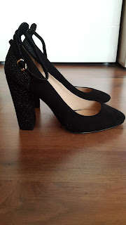 Pantofi noi, Massimo Dutti, din piele întoarsă fină, interior piele, talpa din piele. Toc cu particule fine strălucitoare. Înălțime toc 10 cm. Bareta pe glezna.