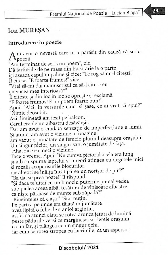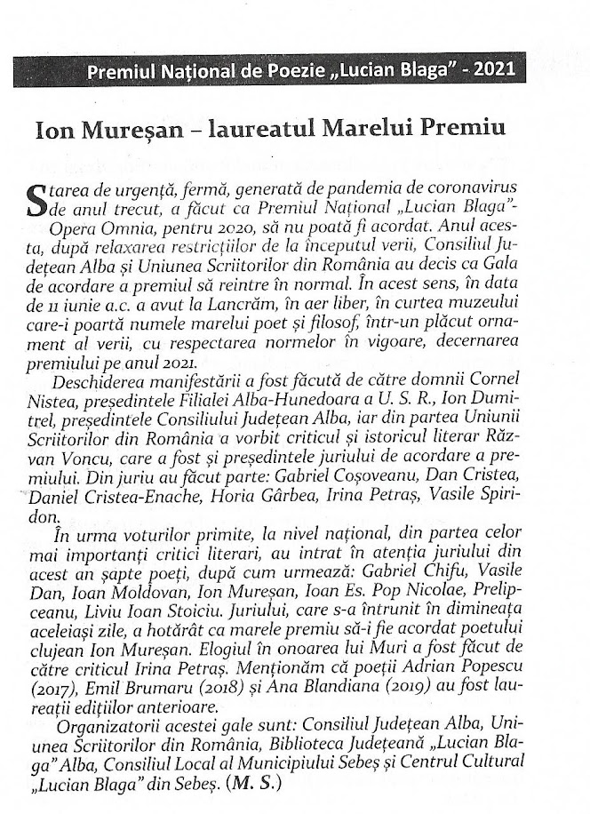Litere • 16.10.2025 • 348 Opțiuni pentru acest articol Raportează o problemă Raportează acest articol Spune-ne ce nu este în regulă. Echipa noastră editorială va analiza raportarea în cel mai scurt timp. × Email Nume Motivul raportării Selectează motivulConținut ilegalÎncălcarea drepturilor de autor (DMCA)Spam sau conținut promoțional abuzivHărțuire sau atac la persoanăInformații false sau înșelătoareAlt motiv Detalii suplimentare Trimite raportul Revista „Discobolul” : PREMIUL NAȚIONAL DE POEZIE „LUCIAN BLAGA” - 2021. Laureatul - Ion Mureșan. Semnal, scurtă prezentare, poemele Stancu Constantin Citește pe site-ul original Distribuie: X Facebook LinkedIn Reddit WhatsApp Copiază linkul Distribuie: X Facebook LinkedIn Reddit WhatsApp Copiază linkul