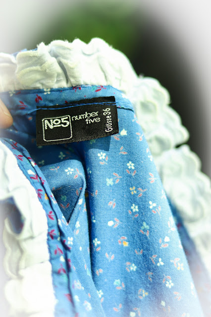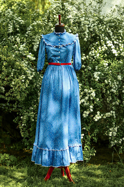 Rochie maxi vintage albastră din bumbac, absolut spectaculoasă cu print floral,cu volănașe și broderie,cu guler stil victorian.Căptușită de la talie în jos.Prezintă buzunare laterale,având ca sistem de închidere fermoar lung lateral.Curea originală lipsește,dar curea roșie din piele naturală din imagine,este inclusă în preț,