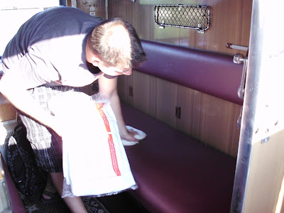 In fine, ajungem noaptea 11:30 la una din cele 7 gari ale Moscovei, sub indrumarea si obladuirea simtului orientativo-organizatoric deosebit al Mirunei. Aparent sunt doua gari intr-una singura – o nebunie! Lume agitata peste tot, panouri cu plecari/sosiri in rusa (deci inutile), un mic haos organizat, accentuat de faptul ca era bezna afara si gara e slab luminata. Ma rog, ruseste asa. Stiind ca ne asteapta 4 zile pe tren si ca pe segmentul Buc-Moscova cam ramasesem fara apa in doua zile, trebuia sa facem plinul la bidoane de apa, respectiv Pepsi/Cola – fiecare cu a ma-sii. In aceeasi graba, agera, sprintena si iute la orientare, Miruna scoate biletele si intreaba un nene in uniforma aratandu-I biletele ‘where is this?’ Nenea respectiv opreste un alt nene, mai tanar, in aceeasi uniforma; a turuit el in rusa, se mai uita pe bilet, mai turuia in rusa uitandu-se la noi asteptand probabil reactii/aprobari. In cele din urma ne unim gandurile cu ale lui si prin puterea mintii intelegem ca vrea sa-l urmam. Zis si facut, ne-a dus fix pana la peronul bun, slava D-lui. Tovarasele mele de drum nu cred, dar eu zic ca am economisit mult timp, am fi stat sa cautam peronul un milliard de ani lumina.