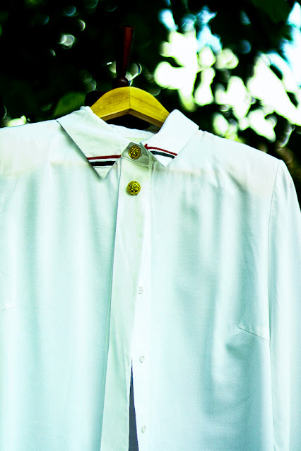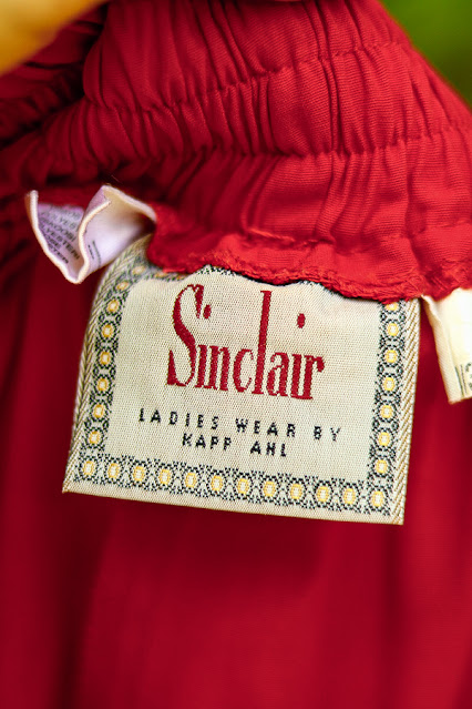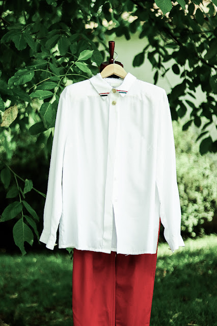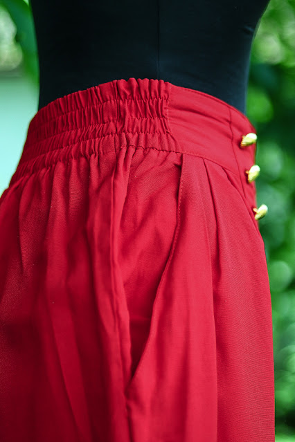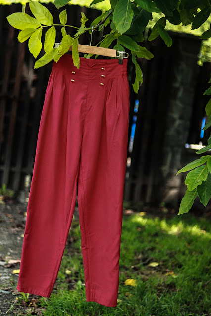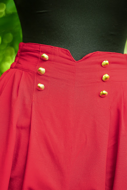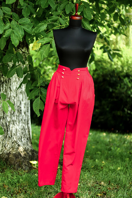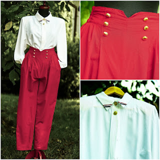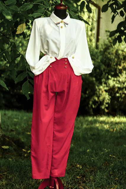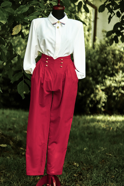 Set compus din pantaloni retro Sinclair de culoare roșu carmin,cu talie înaltă,cu buzunare laterale,elastic pe talie în spate,decorată cu nasturi bijuterie aurii în formă de scoică + cămașă albă cu nasturi bijuterie aurii pe manșete și două la baza gâtului,la închidere.
