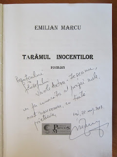 De curând am citit unul din cele mai fascinante romane al scriitorului ieșean, Emilian Marcu , anume TĂRÂMUL INOCENȚILOR. Unde se află acel tărâm? E un mister. Nu e nicidecum vorba despre un trib sălbatic. E cu totul altceva și aici este marele mister pe care îl țese Emilian Marcu în acest roman. Dar pentru a ajunge să înțelegem TĂRÂMUL INOCENȚILOR , trebuie mai întâi să citim unul dintre cele mai bune romane, în opinia mea, scrise după 1989, anume TOBELE MUTE. „Nimeni din lumea cealaltă, după cum avea să afle mai târziu: că vine din lumea cealaltă, nu se arată și nu se lasă văzut până acum aici.” Personajul principal, Sașa Ilici, singurul bărbat peste o turmă de femei văduve de război, pleacă în urmărirea câinelui care luase urma unui urs în pădurea siberiană. Urmărindu-l cade într-o prăpastie și ajunge pe un alt tărâm pe care l-a numit TĂRÂMUL INOCENȚILOR. Unde se află acel tărâm al inocenților? Ei , aici este marele mister , pe care Emilian Marcu îl dezvăluie în roman. ( Un mic omagiu pentru un scriitor mare de ziua lui Emilian Marcu) LA MULȚI ANI MAESTRE!