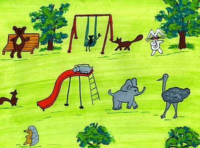 Pe băncuţă-n părculeţ, Se-odihnea un ursuleţ. Iute vine şi maimuţa Şi-ncepe să se dea huţa.